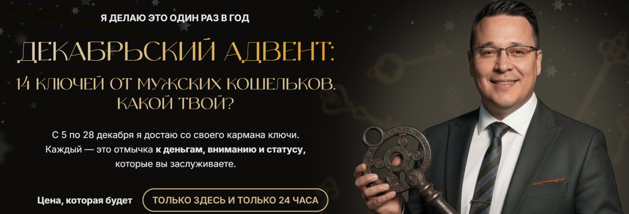 С 5 по 28 декабря я достаю свои личные Ключи. Это отмычки к твоей новой жизни. Каждый ключ — это гарантированный, стопроцентный подгон, который даст тебе деньги, мужское...